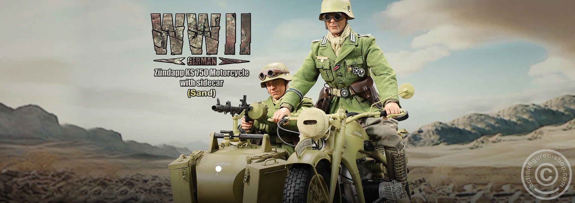 DID proudly presents you the latest masterpiece, the 1/6 WWII German Zündapp KS 750 Motorcycle with sidecar. We have designed three classic colors for it: Camouflage, Grey, and Sand !