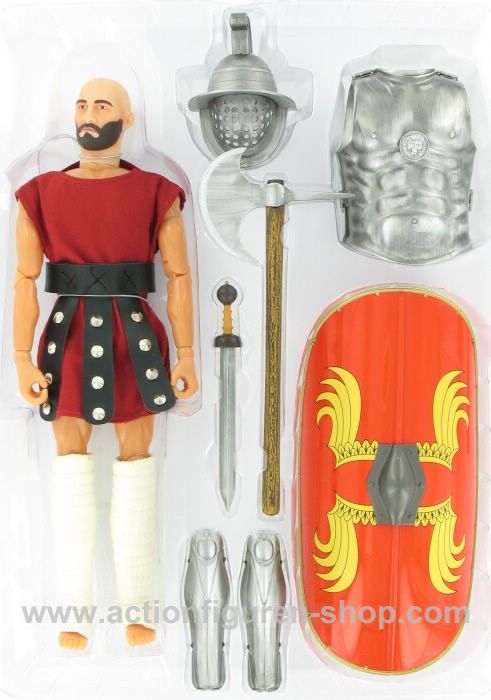 Figur Myrmillo mit leichter Bekleidung bestehend aus Unterhose, rotes Hemd und roter Rock, Brustpanzer, ein breiter Gürtel mit Verzierungen, Schienen und Polsterung für die Beine, langer Streit-Axt und ein langes Schwert sowie der typische Helm mit Visier und ein großes Schild, welches in römischer Legonärsart lackiert ist.