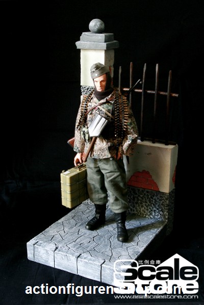 Diorama einer Straßen-Szene mit Mauer-Zaun-Element und Säule - im Maßstab 1:6