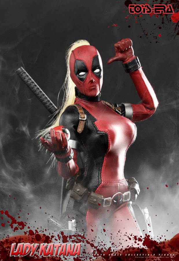 Lady Katana - die Superheldin mit dem losem Mundwerk - gemeint ist Lady Deadpool. Die Figur ist bekleidet mit dem typischen, rot/schwarzen Jumpsuit, Produziert aus einem flexiblen, dünnen lederartigen Material, das die Beweglichkeit der Figur kaum einschränken soll. Viel Zubehör wie zwei Schwerter (Katana), zwei Pistolen, Handgranaten, ein Gummi Huhn sowie eine Extra Hand mit Stinke-Finger, zeichnen diese Figur aus.