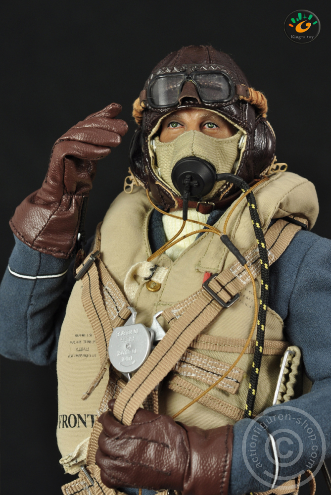 Die lang erwartete Figur eines Piloten der Britischen Royal Air Force aus dem Zweiten Weltkrieg. Die Figur kommt mit der typischen blauen RAF Uniform mit Fliegerabzeichen, einer Lederjacke, Flughaube/Helm mit Sauerstoffmaske, Revolver, Holster, "Mae West" Schwimmweste und Fallschirmpack sowie vielen weitern Ausrüstungsteilen.