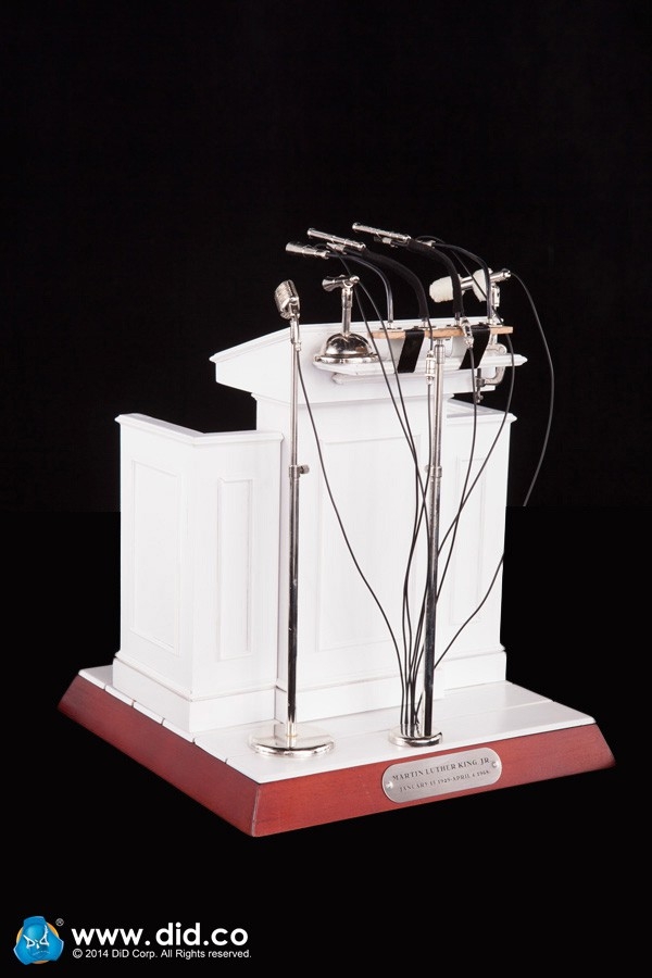 Ausdrucksstarke Figur, sehr gut getroffener Kopf, authentische Belkeidung und Ausstattung. Das Podium mit Mikrophonen dient als Mini-Display und spielt auf Knopfdruck Sound aus seiner berühmten Rede "I have a Dream....".