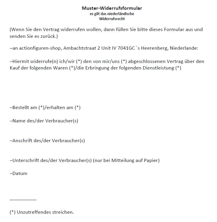 The revocation must be sent to: actionfiguren-shop.com – Ambachtstraat 2 – 7041 GC s-Heerenberg, Netherlands.